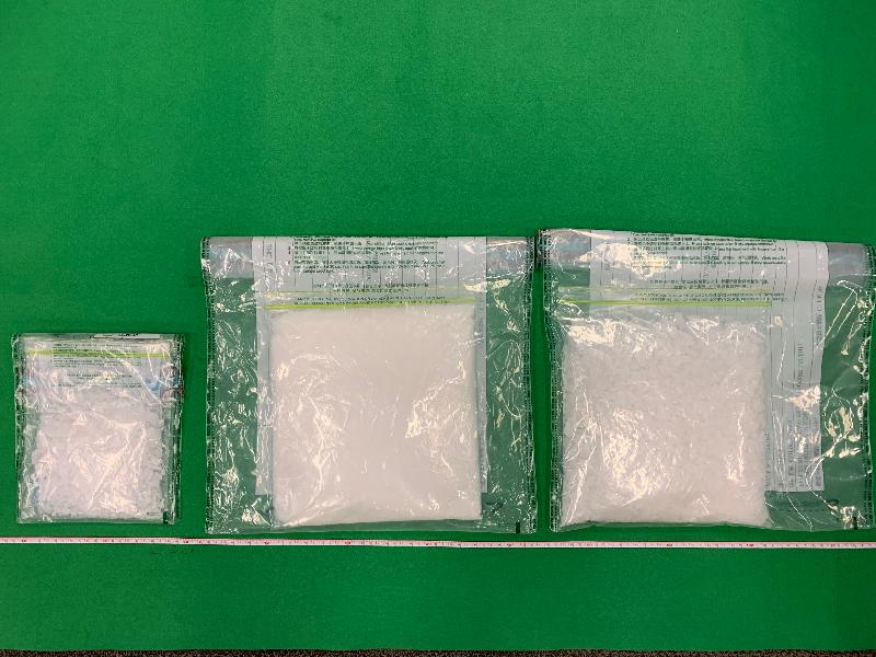 After a follow-up investigation, Customs officers escorted the arrested man to a factory unit nearby, where about 1.9kg of suspected methamphetamine and a batch of drug-packaging paraphernalia were further seized.