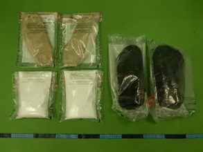 Also, a male passenger arrived in Hong Kong from Johannesburg, South Africa was intercepted by Customs officers for examination. About 1kg of suspected cocaine was found concealed inside the false compartments of the shoes worn by him. The three passengers were then arrested.