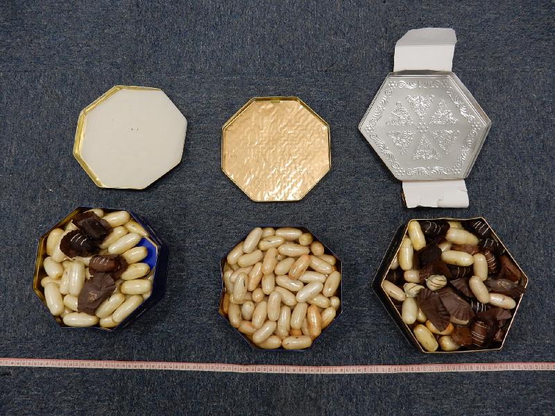 The arrested woman arrived at Hong Kong from Dubai, United Arab Emirates last night. During customs clearance, Customs officers found three chocolate candy boxes inside a plastic bag she carried. In-depth examination led to the discovery of 183 pellets of suspected cocaine with a total weight of about 3.65 kilograms.