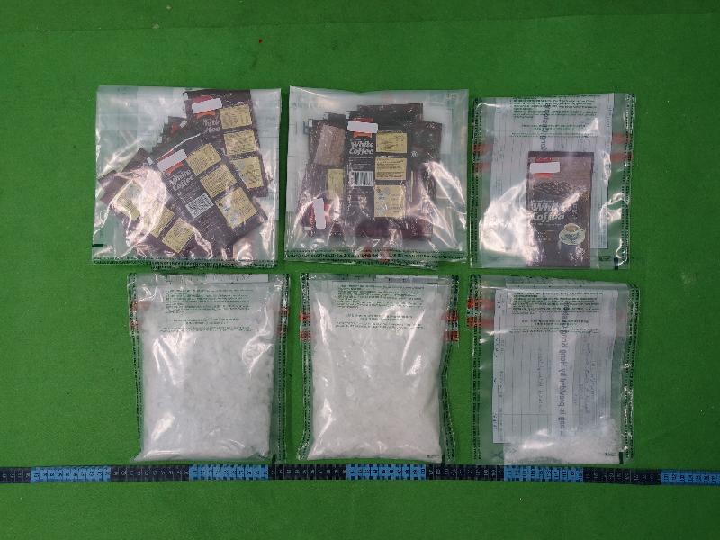 In the first case, Customs officers inspected an air postal parcel that arrived from Malaysia at Hong Kong International Airport on March 17 and seized about 1kg of suspected methamphetamine with an estimated market value of about $540,000 concealed under coffee powder packages.
