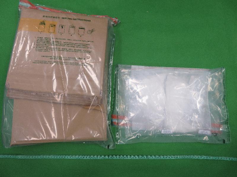 In the second case, Customs officers found a Malaysian parcel on board an in-bound lorry at Lok Ma Chau Control Point on March 27. About 500 grams of suspected methamphetamine with an estimated market value of about $270,000 was seized inside the carton box interlining of the parcel.