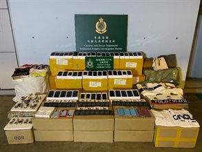 Through risk assessment, Customs officers intercepted an incoming container truck at Man Kam To Control Point on April 9. A batch of about 3 500 items of suspected counterfeit goods, including mobile phones and accessories, watches and clothing, were found inside the container. The 63-year-old male driver was then arrested.