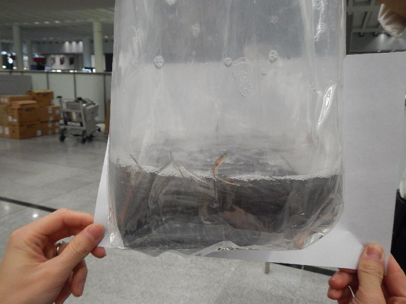 Later, Customs officers conducted Customs clearance on a male passenger arriving in Hong Kong from Bilbao, Spain via Paris, France and found about 48kg of suspected European eel in three pieces of his check-in baggage.