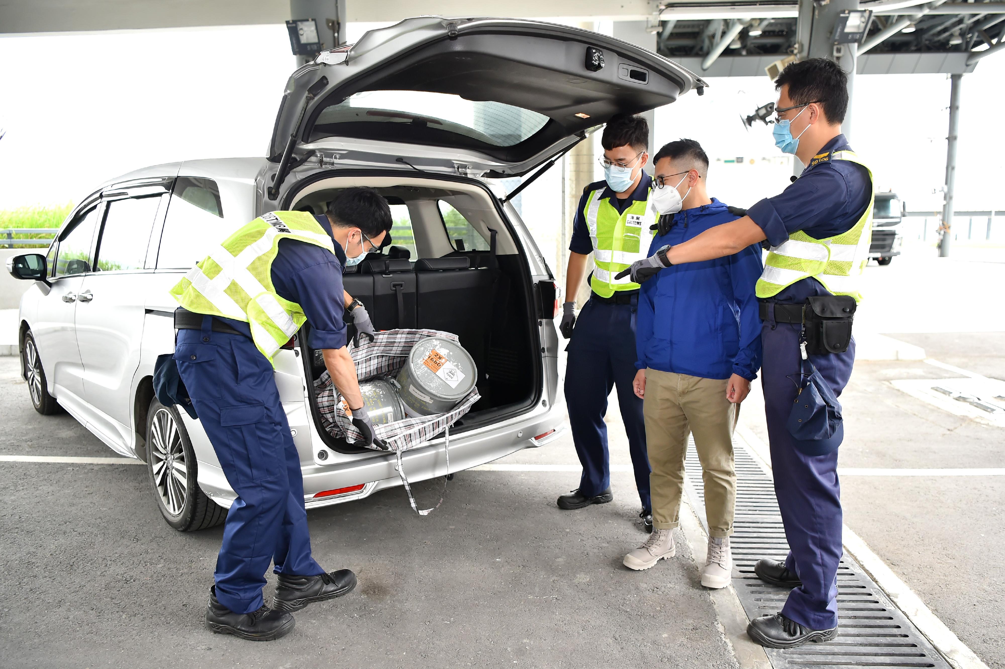 Hong Kong Customs and the Fire Services Department (FSD) co-organised a counter-terrorism intelligence and hazardous material incident exercise codenamed "DEFENDER" yesterday afternoon (May 23) at the Customs Inbound Private Car Examination Building of the Heung Yuen Wai Boundary Control Point.