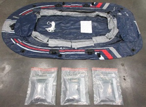 Customs officers examined an air express parcel from Colombia being transshipped to the Mainland of China through Hong Kong yesterday. The batch of suspected cocaine, black in colour instead of the conventional white colour, was found concealed inside a deflated rubber boat. It is believed that that culprits intended to use this approach to evade detection by law enforcers.