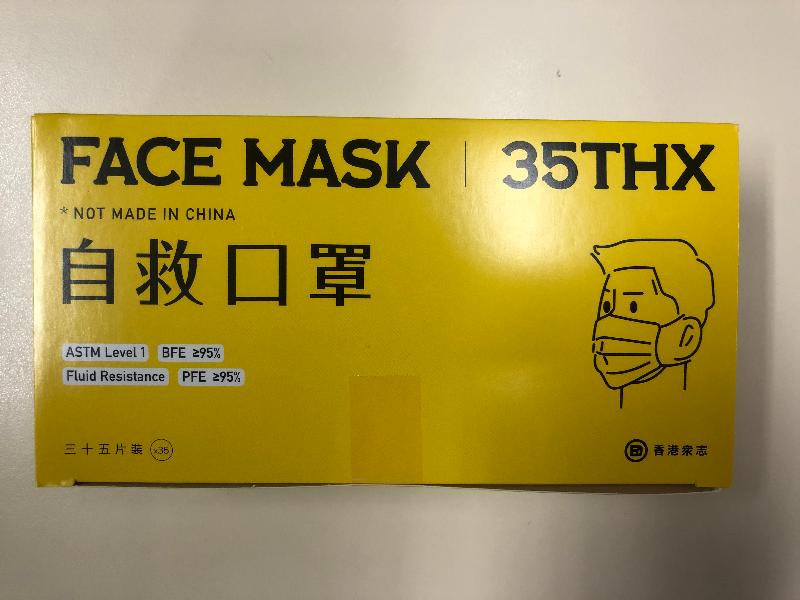 Apart from strengthening compliance promotion work at the production source level, Customs is also continuing to conduct enforcement operations. Customs earlier received information alleging an online trader supplied through restaurants a type of surgical mask with suspected false claims of origin and efficiency. The product was labelled with "NOT MADE IN CHINA", "ASTM Level 1", "BFE≥95%", "Fluid Resistance" and "PFE≥95%". Upon receiving the allegation, Customs conducted a test-buy operation and follow-up investigation.