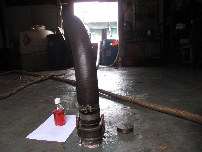 During an anti-smuggling patrol in the early morning, Customs officers of the Marine Enforcement Group intercepted a 190-tonne fishing vessel off Lamma Island. Upon searching, officers found neither fishing gears nor marine catch onboard but a huge quantity of marked oil from the fuel tanks of the vessel. It is believed that the fishing vessel was engaged in the smuggling of marked oil. The vessel together with four crew members onboard and the marked oil were detained for further investigation.