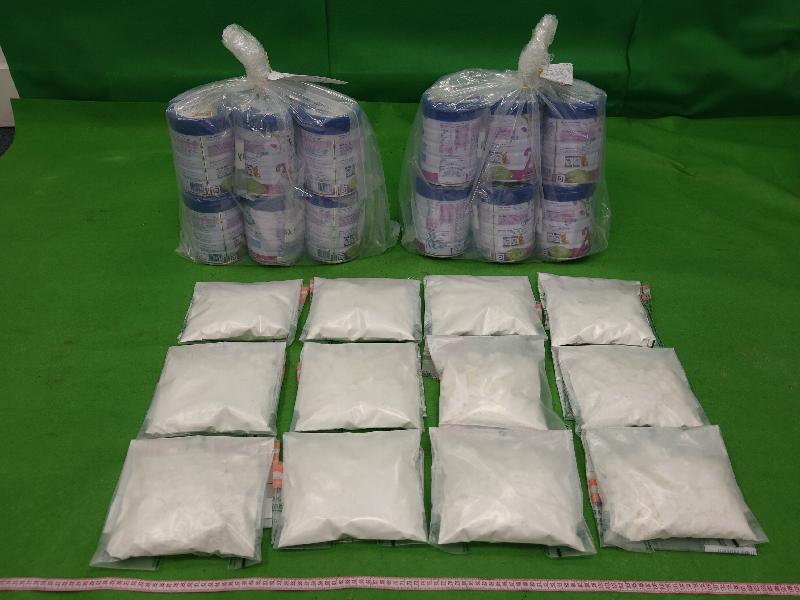 Customs officers inspected an air cargo consignment arriving in Hong Kong from the Netherlands at HKIA yesterday. The batch of suspected cocaine was found concealed inside 12 powdered formula cans.