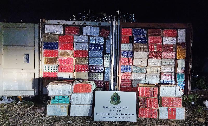 Customs officers yesterday mounted an anti-illicit cigarette operation in Shek Lau Po, Tung Chung, and discovered the batch of suspected illicit cigarettes concealed inside two abandoned 20-foot containers in a remote area. A 43-year-old man who claimed to be unemployed was arrested.