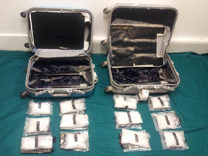 Customs officers today (March 1) intercepted at the restricted departure area of Hong Kong International Airport two male passengers departing for Tokyo, Japan and seized about 2.5 kilogrammes of methamphetamine ("Ice"). The drugs were concealed inside false compartments of their checked-in suitcases with an estimated market value of about HK$1.9 million.