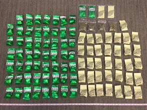 Officers of the Customs Drug Investigation Bureau yesterday evening intercepted a man in Kowloon City and found respectively on him and in his travelling bag 14 grams and 1.3kg of suspected cannabis buds that were concealed in 95 sealed tea bags.