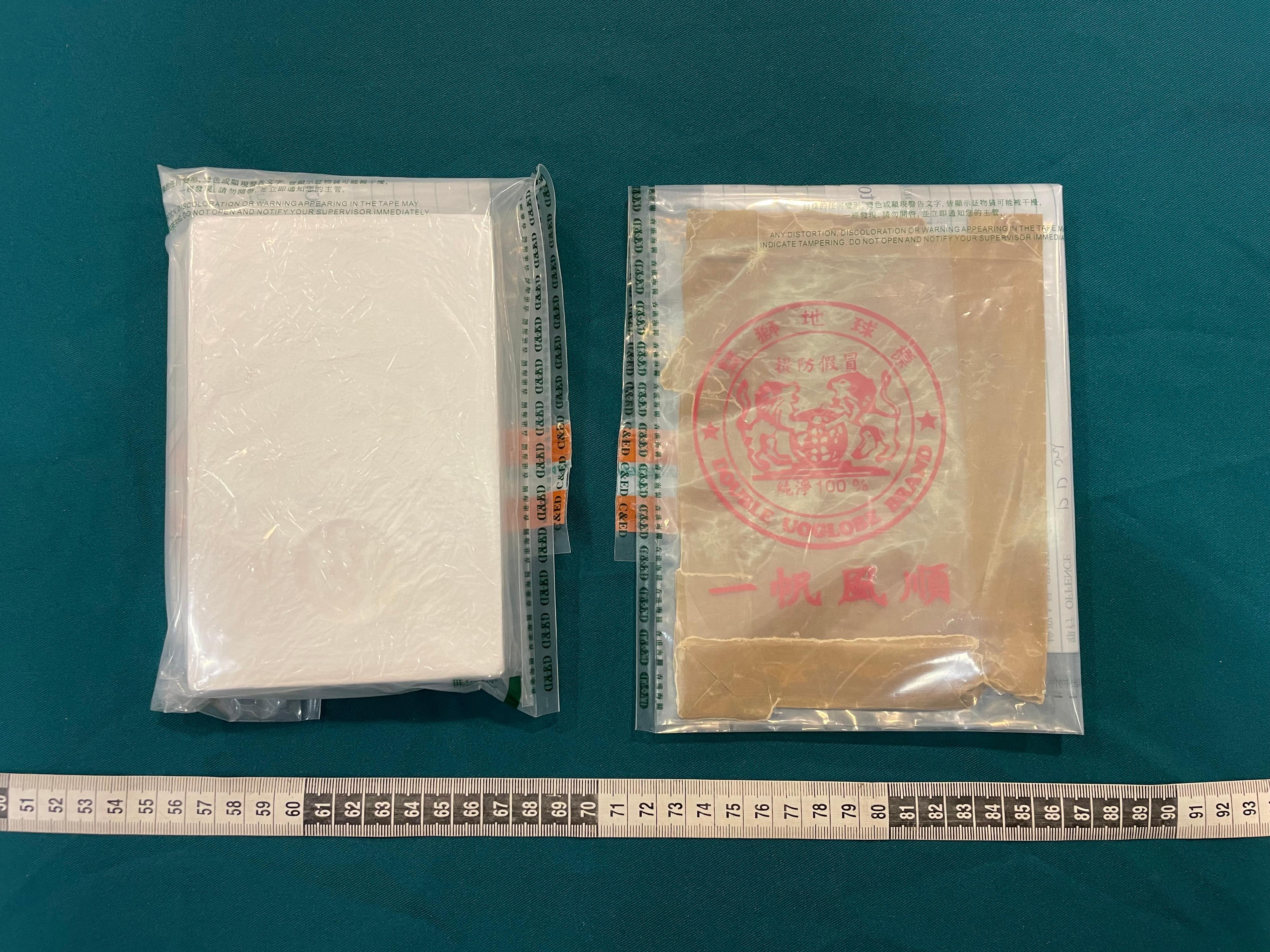 After follow-up investigation, Customs officers searched three residential premises in Sham Shui Po yesterday. About 350g of suspected heroin with an estimated market value of about $360,000, a small quantity of other drugs (including ketamine, ecstasy, cannabis buds and methamphetamine), a batch of drug packaging paraphernalia and a batch of banknotes valued at about HK$640,000 were seized. Three men aged between 44 and 62 suspected to be connected with the case were arrested.
