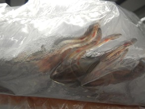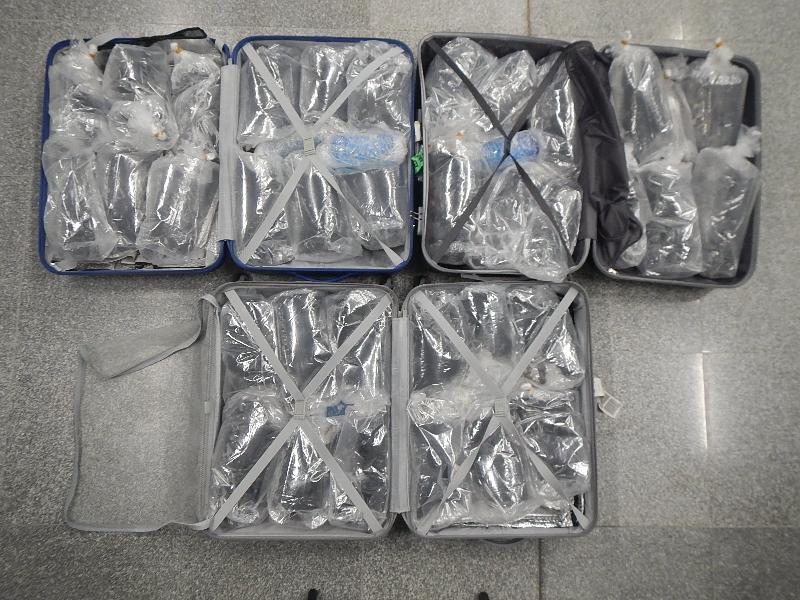 Customs officers conducted Customs clearance on two passengers at the airport this afternoon. Both passengers arrived in Hong Kong from Vigo, Spain via Madrid, Spain and Amsterdam, the Netherlands. During the clearance, Customs officers found about 91kg of suspected European eels in the passengers' six pieces of checked-in baggage.