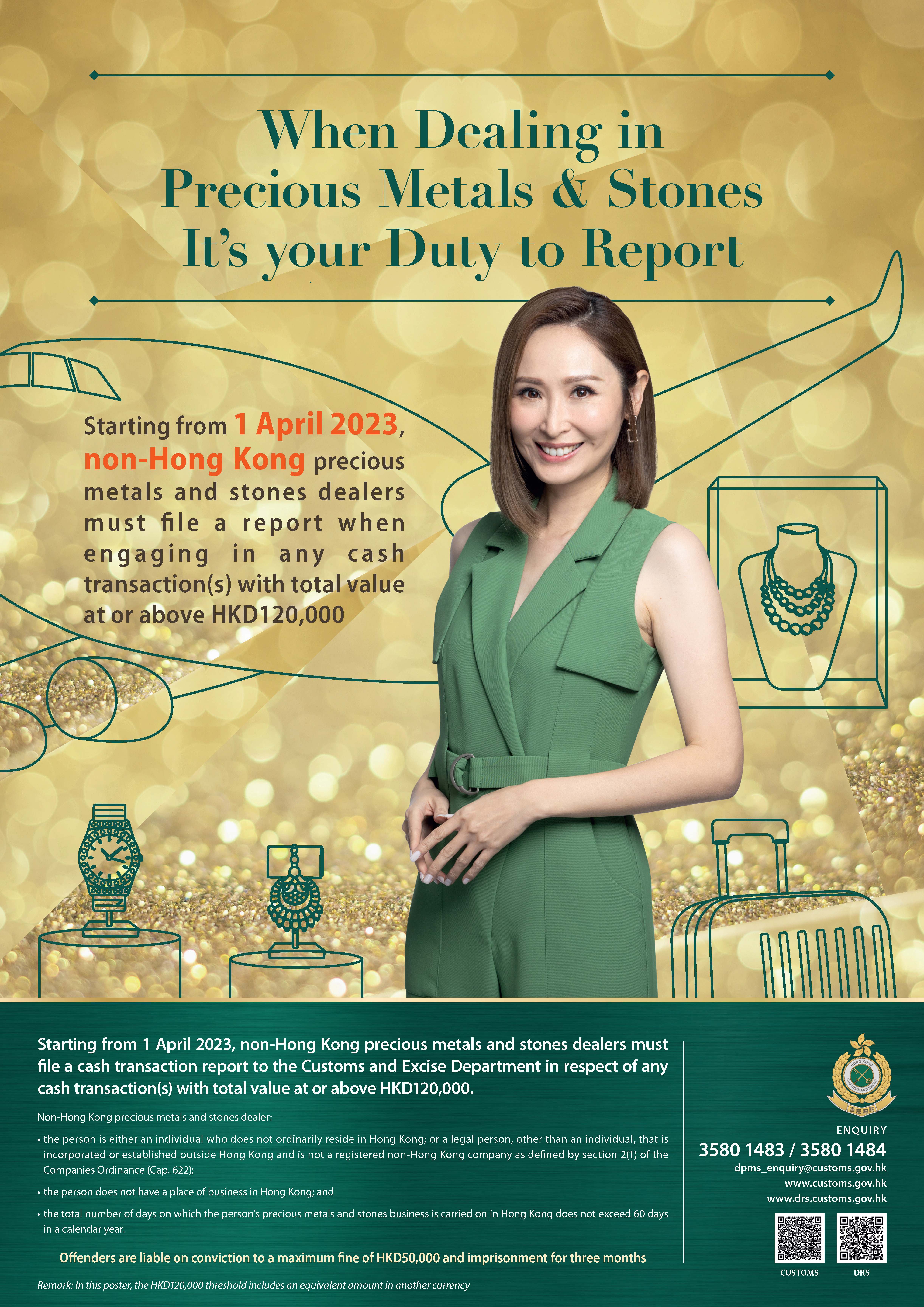 Poster on Non-Hong Kong Precious Metals and Stones Dealers to Submit Cash Transaction Report (Implemented from 1 April 2023)