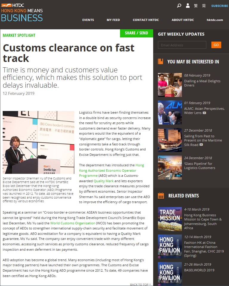 To further promote the HKAEO Programme, Officers from Office of Supply Chain Security Management (OSCS) has cooperate with different trade associations and institutions for publishing articles in various platforms.