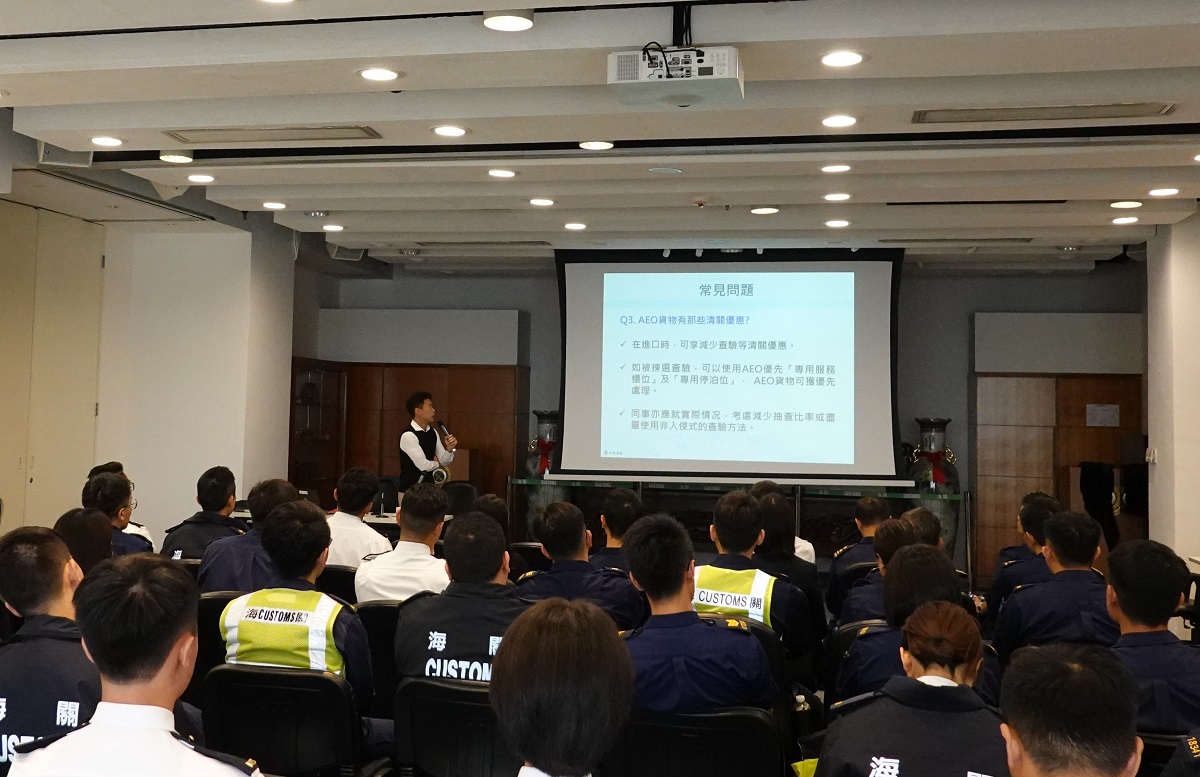To ensure a smooth customs clearance for the accredited Hong Kong Authorized Economic Operators (HKAEO), there is a need for the frontline Customs Officers to grasp the most updated information of the Programme. Office of Supply Chain Security Management (OSCS) of Hong Kong Customs offers regular briefings and trainings to frontline Customs Officers on the development of the HKAEO Programme. In 2019, OSCS held 16 briefing sessions on the HKAEO Programme with around a thousand Officers involving in the supply chain attended.