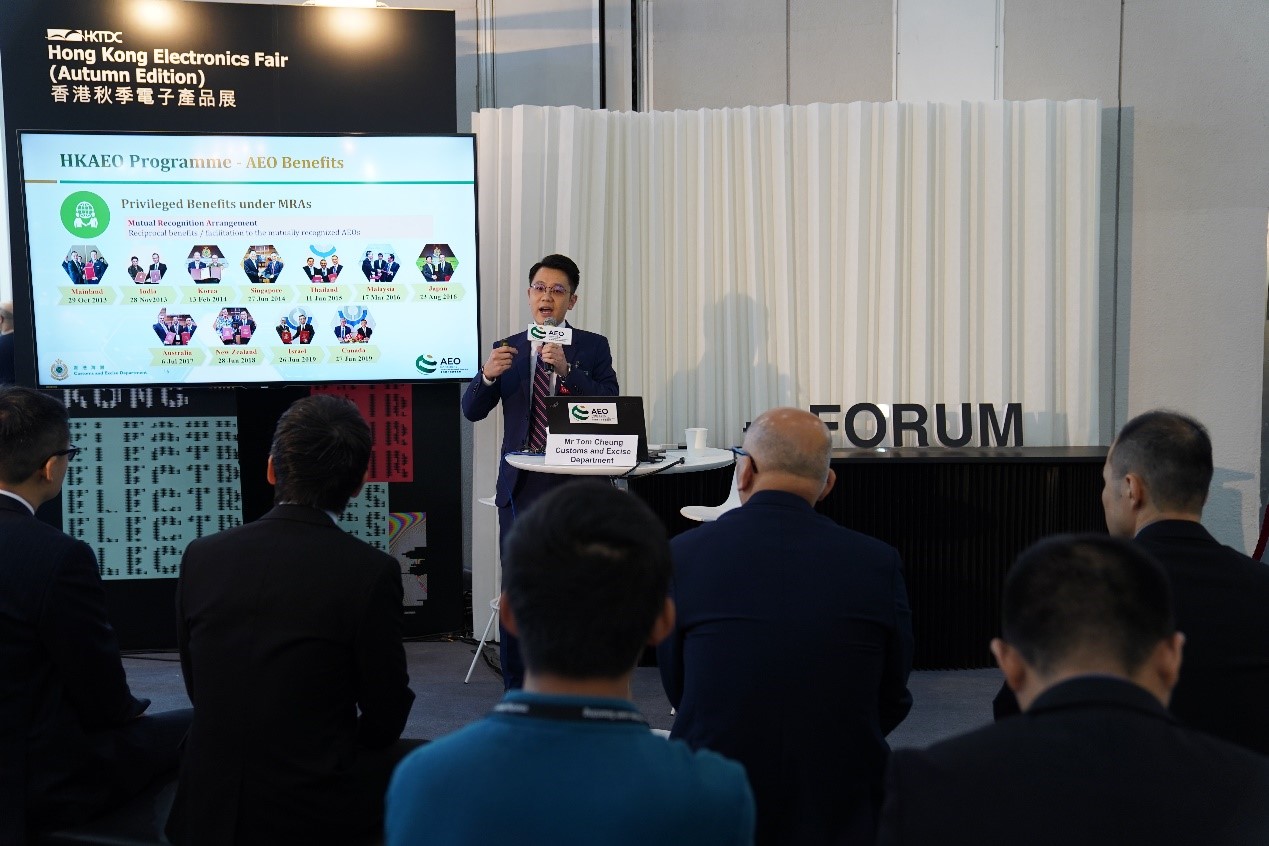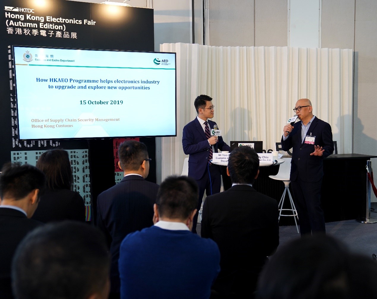 In a bid to help electronics industry to upgrade and explore new opportunities, Office of Supply Chain Security Management (OSCS) of the Hong Kong Customs and Excise Department held a seminar to introduce HKAEO Programme at the Hong Kong Electronics Fair (Autumn Edition) 2019 organized by the Hong Kong Trade Development Council today (15 October 2019).