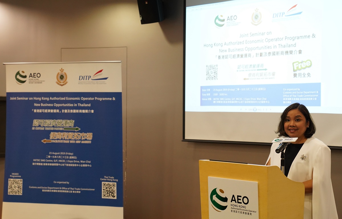 Hong Kong Customs and Excise Department (C&ED) and the Office of Thai Trade Commissioner of Royal Thai Consulate General in Hong Kong co-organized a seminar today (23 August 2019) on “Hong Kong Authorized Economic Operator (HKAEO) Programme and New Business Opportunities in Thailand”. Nearly 100 participants attended the seminar.