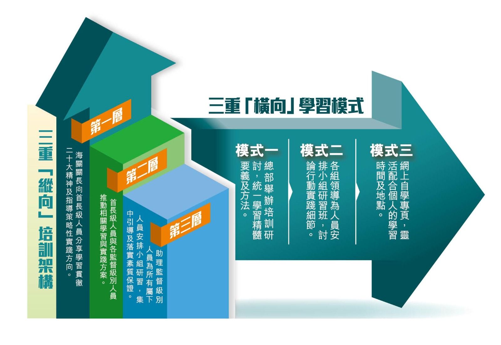 中國共產黨第二十次全國代表大會(二十大)報告關係到國家與香港在「新時代新征程發展」的戰略計劃及佈局,為實現第二個百年奮鬥目標指明了前進方向,確立了行動指南。香港海關對學習貫徹二十大精神及全面實踐推進在工作和建設層面上極為重視,建立了三重縱橫培訓網,透過多元而有序的培訓網,縱橫兼備全面擴展培訓涵蓋面,加深人員對二十大精神的認識、理解和領會,融入海關工作的目標、行動和態度中。