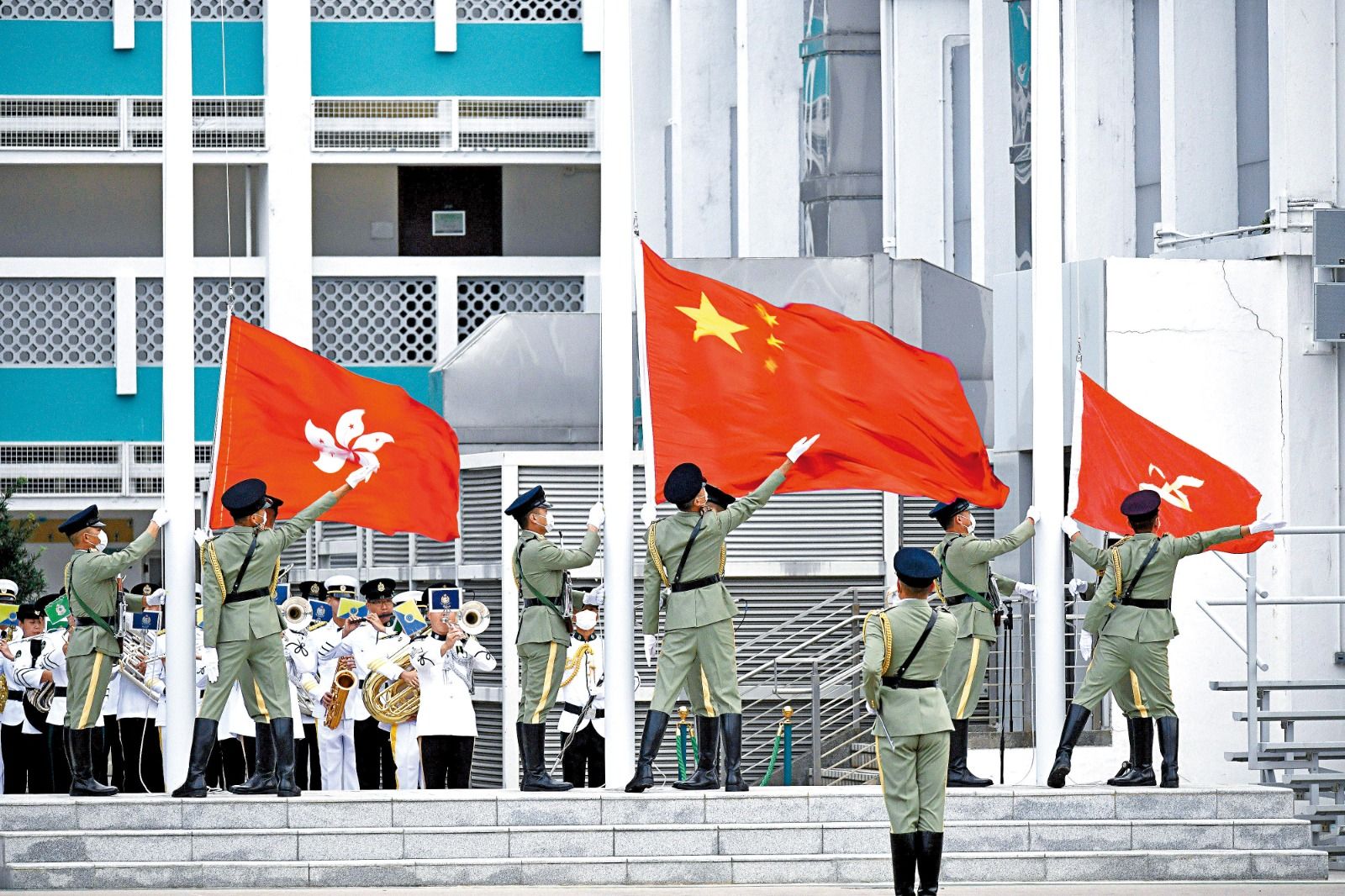 升旗儀式首先由紀律部隊聯合樂隊 (包括香港警務處、香港海關、入境事務處及香港懲教署) 進行軍樂操。