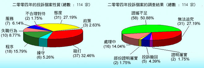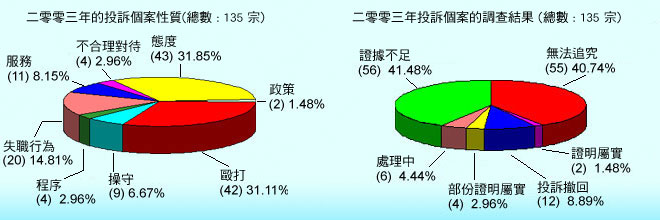 10. 以下圖表及數字顯示在二零零三年及二零零四年接獲投訴個案的性質及其後的調查結果。 |