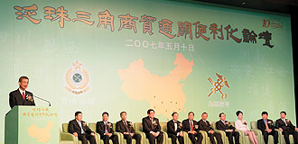 海关总署署长牟新生于二○○七年五月十日出席“泛珠三角商贸通关便利化论坛”开幕礼发表主题演讲。 |