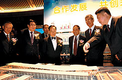 保安局局长李少光、中央人民政府驻香港特别行政区联络办公室主任高祀仁、海关总署副署长刘文杰、香港特别行政区行政长官曾荫权、海关总署署长牟新生、香港海关关长汤显明。深圳海关关长邹志武(右一)在旁讲解。 |