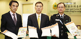 | 二零零六年三月,(左起)監督李章榮先生、高級監督梁麟祥先生及監督王文超先生在一個記者招待會中展示一批檢獲的氯胺酮。 |