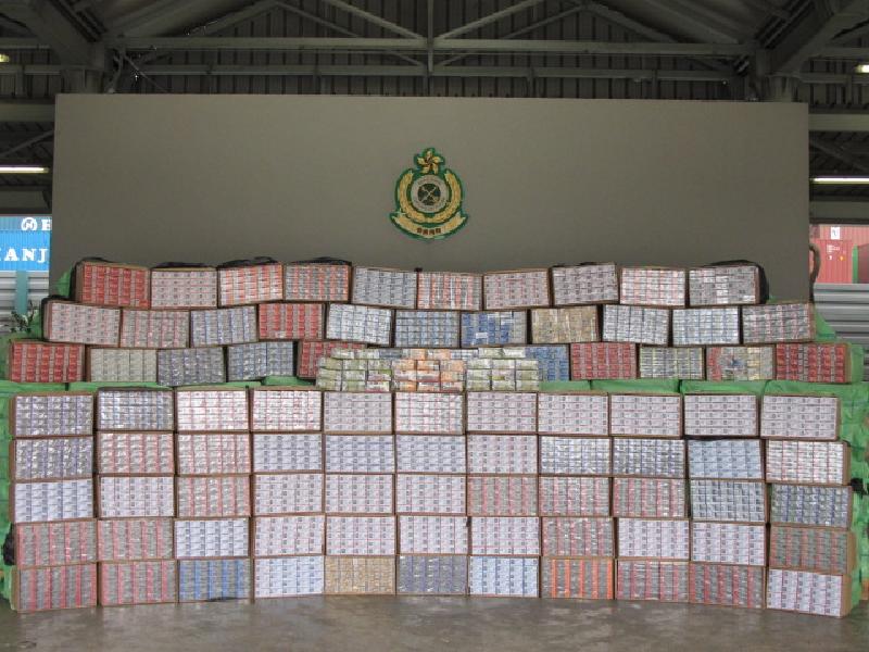 海关透过与海外相关执法部门交流情报,经分析及掌握线索后,抽查一艘来自马来西亚的货柜船上一个报称载有「厕纸」的四十呎货柜,发现货柜内藏有九百三十万支私烟及九十公斤烟草。根据今次走私货物的包装显示,相信该批私烟及烟草最终目的地为澳洲。海关已扣留该批没有列于载货舱单上的私烟及烟草,负责处理该批货物的本地船务代办正协助调查,海关亦会与相关海外执法部门展开跟进调查工作。
