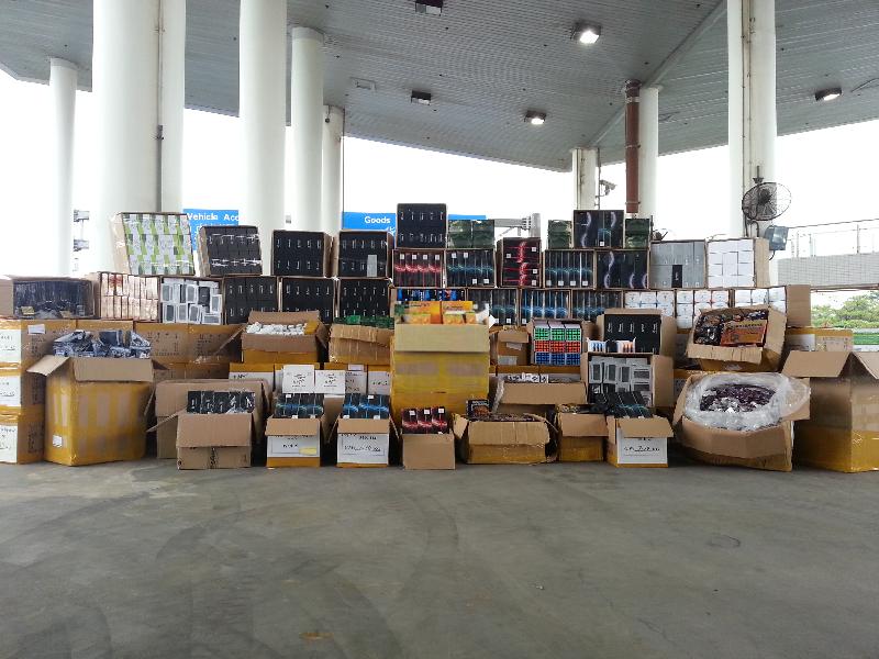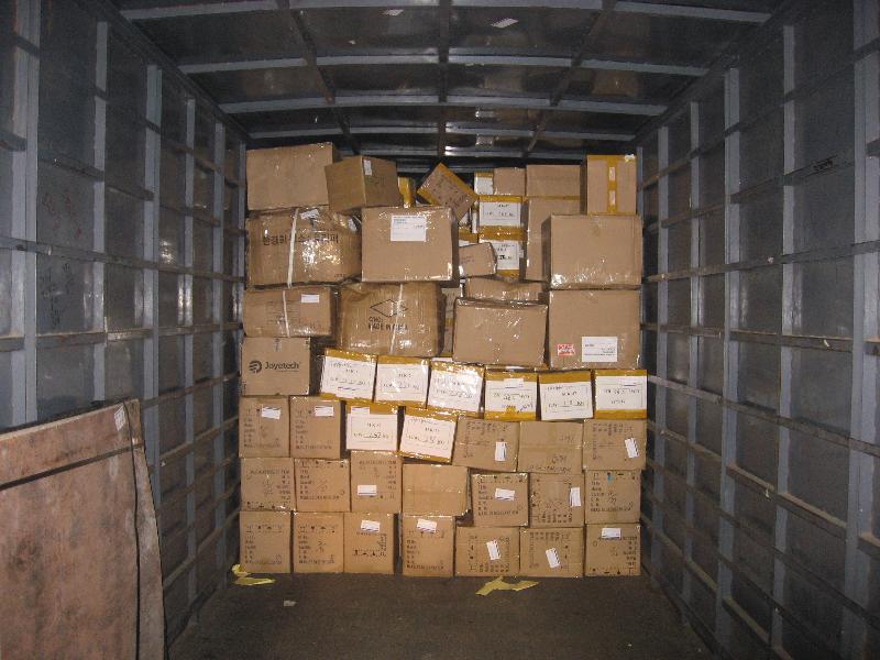 昨日上午约七时,深圳湾管制站海关人员进行反走私行动,截查一辆报称载有连接器、服装和电线的入境货车,经检查后海关人员发现在货斗深处收藏了331箱未列于舱单的货物,包括60 000盒电子烟连「烟弹」、15 000粒及10 000盒怀疑「壮阳药」及其他健康食品,总值约一千一百万元。五十五岁男司机涉嫌触犯「入口未列舱单货物」被捕,案件仍在调查中。