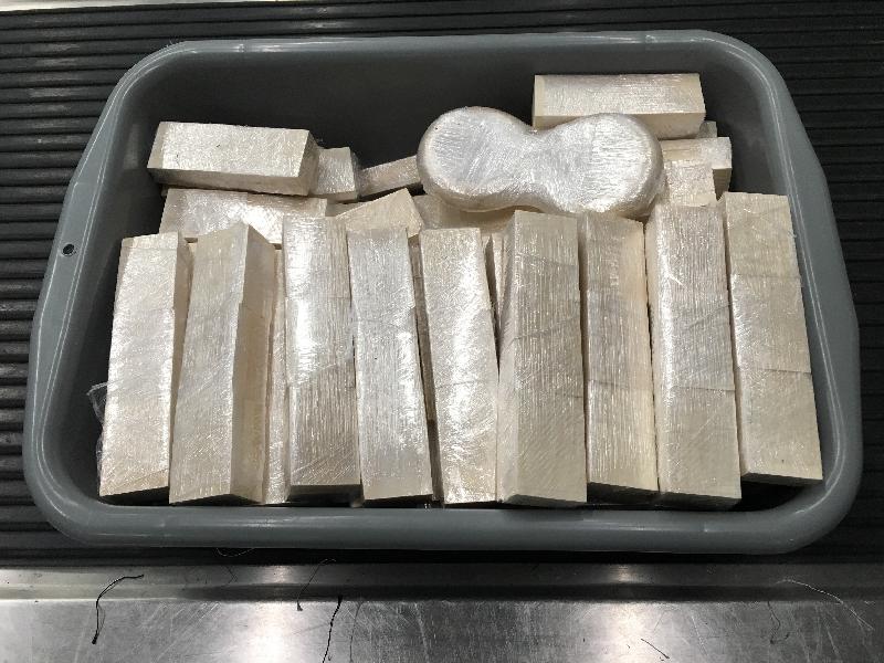 海关人员今日早上在机场截查两名分别为四十岁及四十六岁的男乘客。该两名男乘客日前从津巴布韦哈拉雷出发,经阿拉伯联合酋长国杜拜飞抵本港。海关人员进行清关时,在他们的背包内发现两件特别缝制背心,背心内藏共约四十公斤怀疑象牙制品。案件已转交渔农自然护理署跟进。