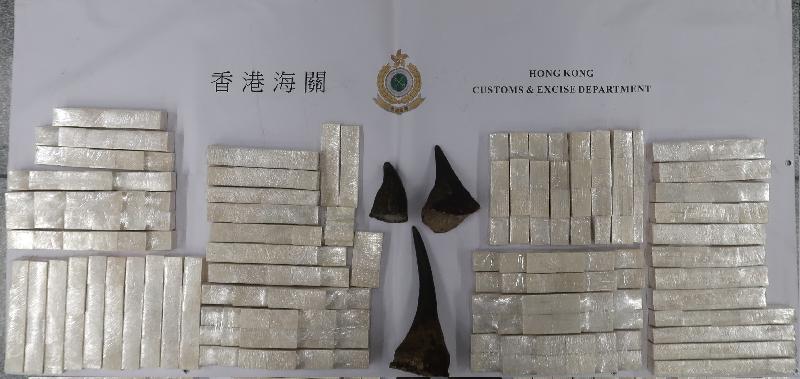 香港海关今日(十月十七日)在香港国际机场检获约四十三公斤怀疑象牙制品及约两公斤怀疑犀牛角,估计市值一百三十万元。