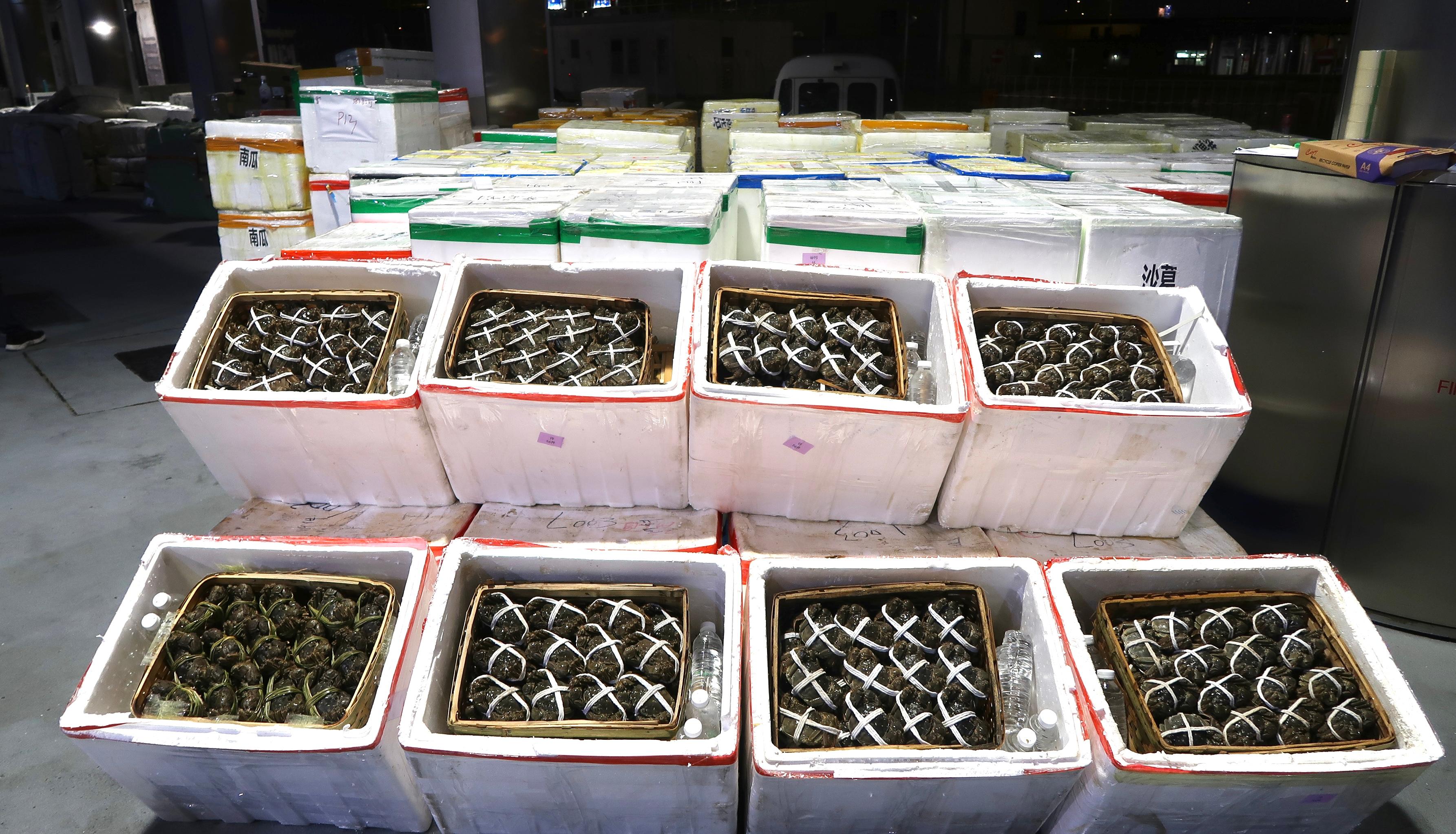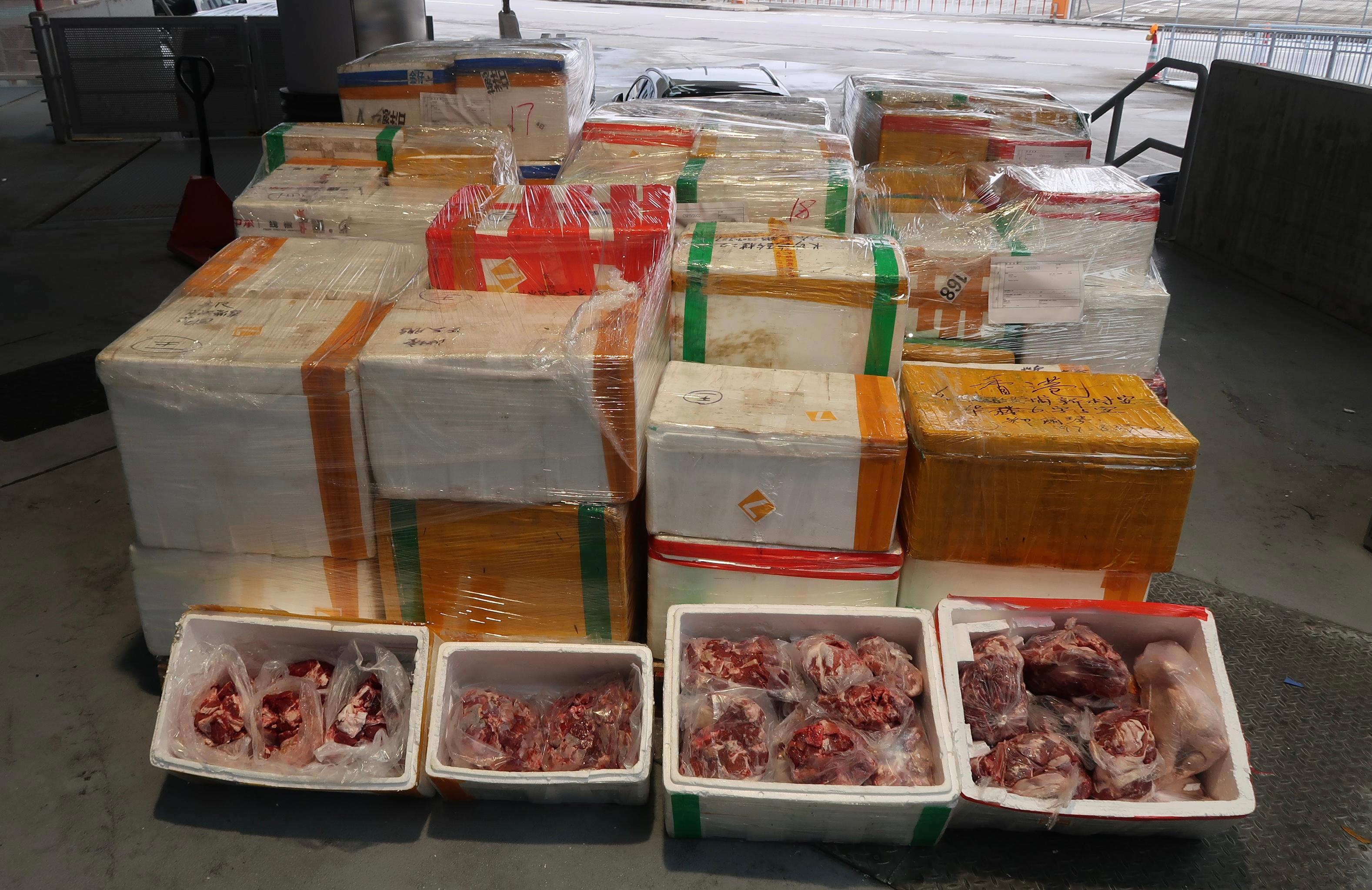 香港海关十一月六日在港珠澳大桥香港口岸检获约五千二百公斤怀疑走私大闸蟹和约二千五百公斤怀疑走私冻肉,估计市值共约二百九十万元。