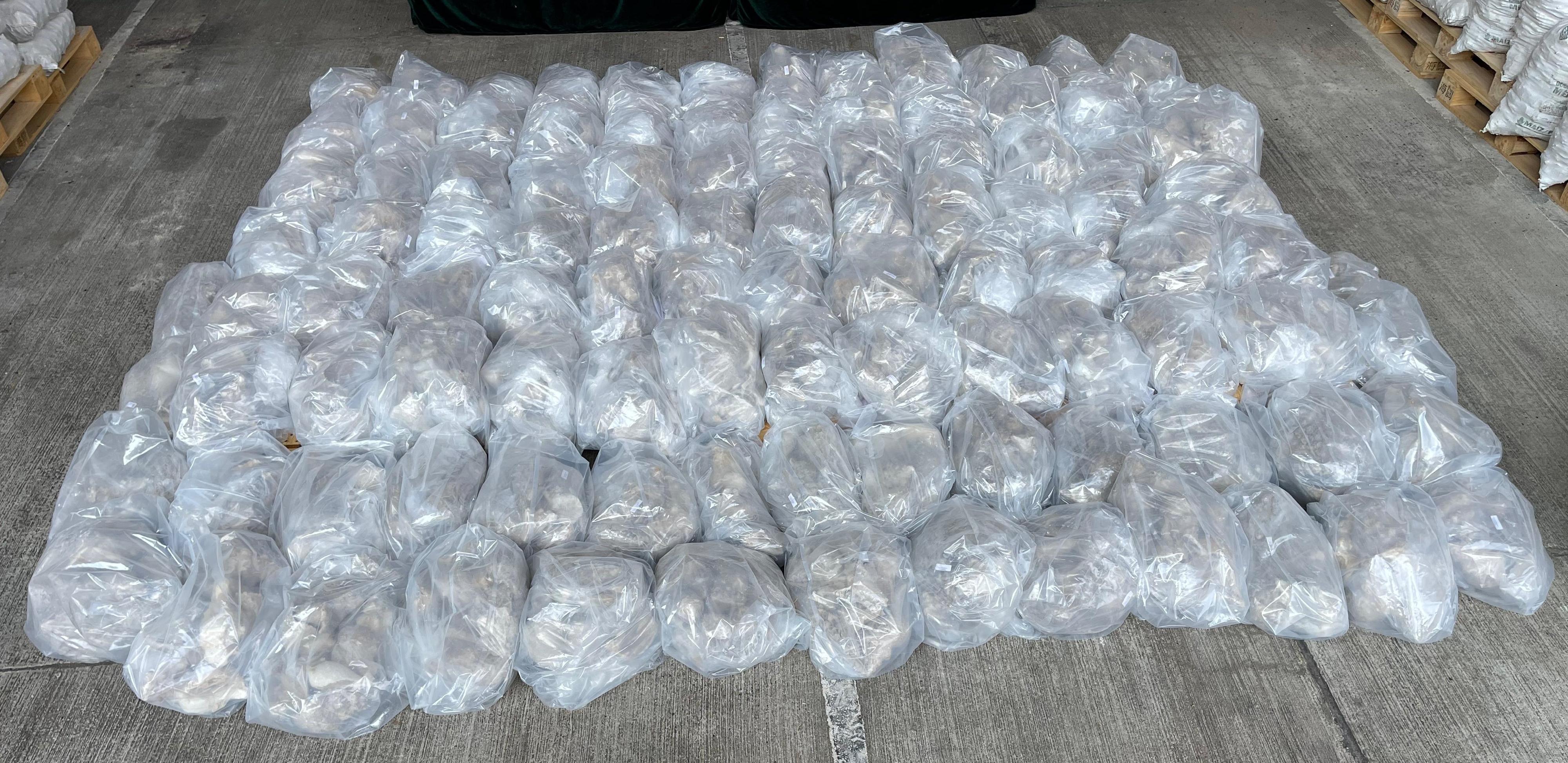 海关当日根据风险评估,拣选及检查一个从墨西哥抵港,报称载有六百一十一袋海产的海运货柜。经查验后,海关人员在一百零四个尼龙袋内,发现一批伪装成贝壳、并与真贝壳混杂一起的怀疑冰毒。该批怀疑冰毒共重约一点一吨。