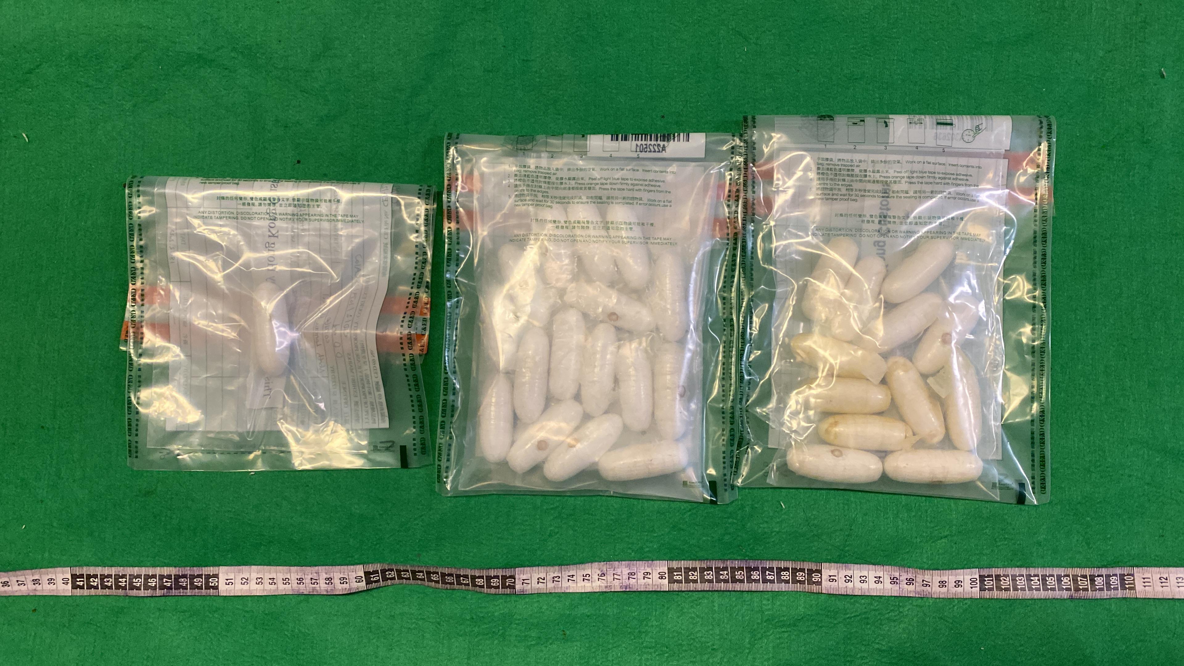 一名三十九岁的男旅客昨日从南非约翰内斯堡抵本港。海关人员替该名旅客进行清关期间怀疑其体内藏有毒品,于是把他带到医院检查。经检查后,医生确认该名旅客体内藏有异物,海关人员随即把他拘捕。截至今日(十二月十九日)下午六时,该名被捕人士已从体内排出二十九粒共重约五百五十克的怀疑可卡因。