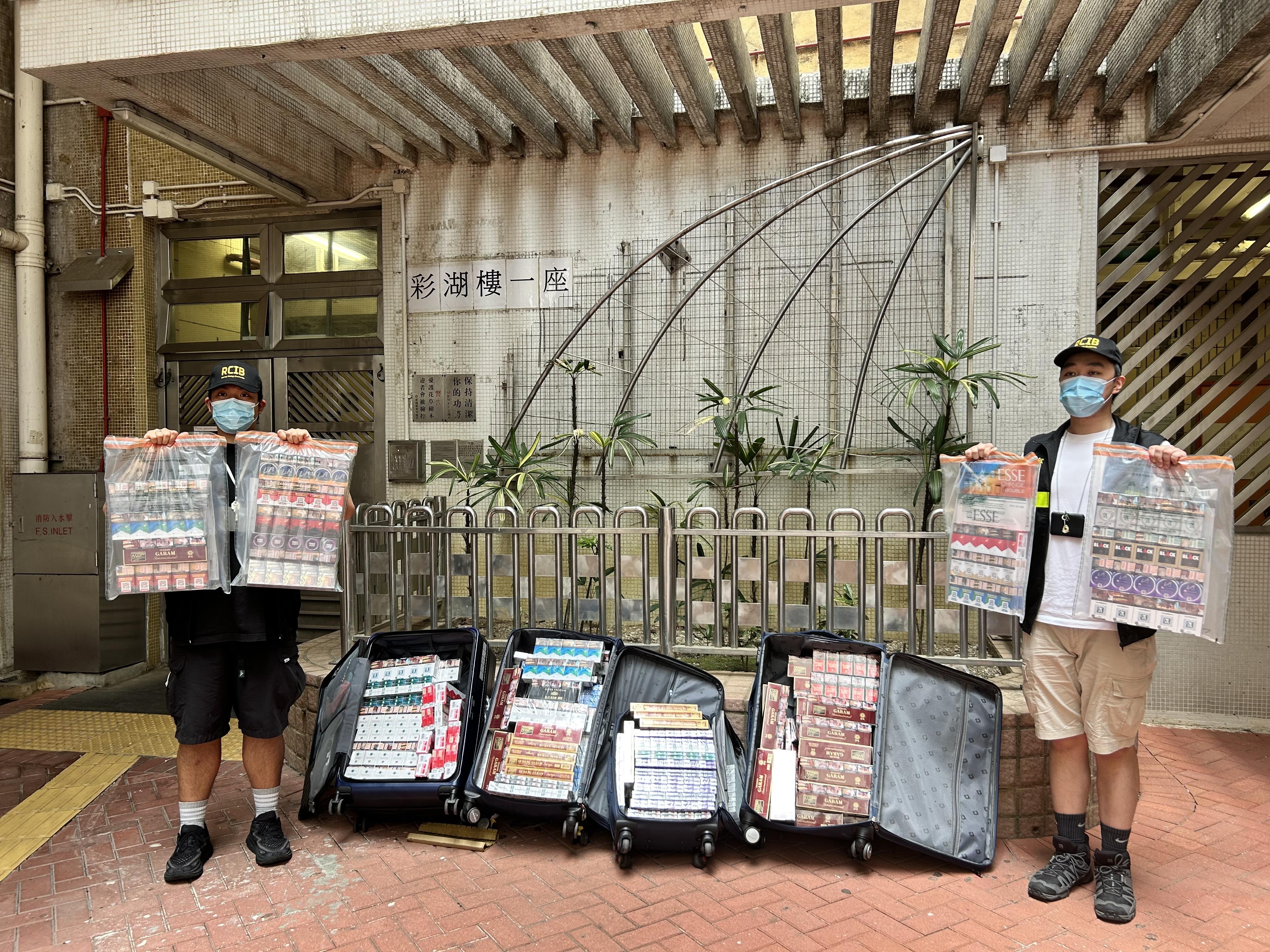 今日早上,海关人员于上水彩园邨发现该两名女子搬运多个尼龙袋,形迹可疑,于是上前截查,并于尼龙袋内发现约9万支怀疑私烟,海关人员随即分别带同该两名女佣返回其邨内雇主的单位调查。其后,人员再于两个公屋单位内合共检获约11万支私烟。