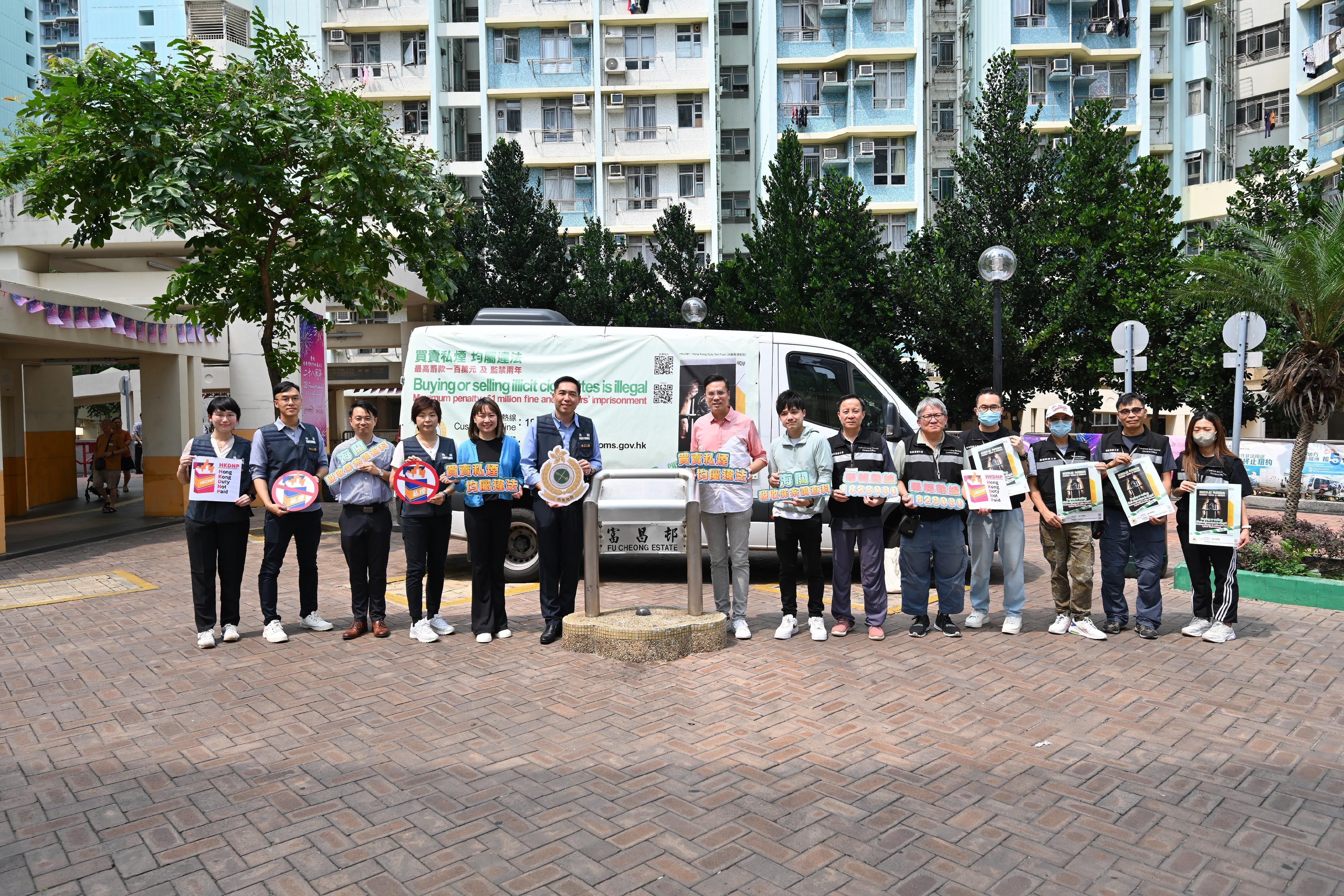 香港海关今日(七月二十八日)与立法会议员梁文广、深水埗区区议员、卫生署控烟酒办公室及房屋署在深水埗富昌邨进行联合反私烟宣传活动。