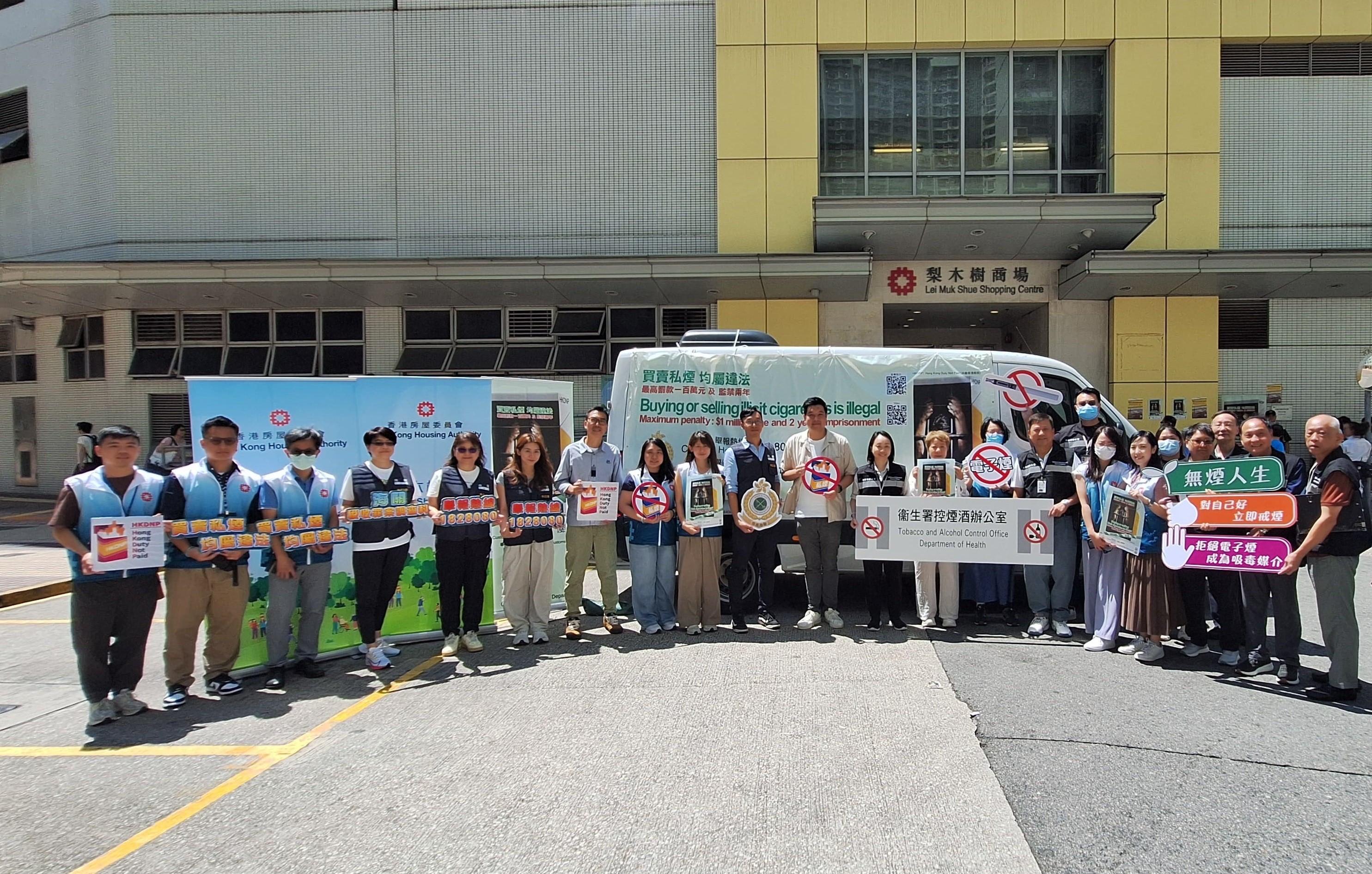香港海关今日(八月二十七日)与荃湾区区议员、卫生署控烟酒办公室、房屋署及社区关爱队在荃湾梨木树邨进行联合反私烟宣传活动。