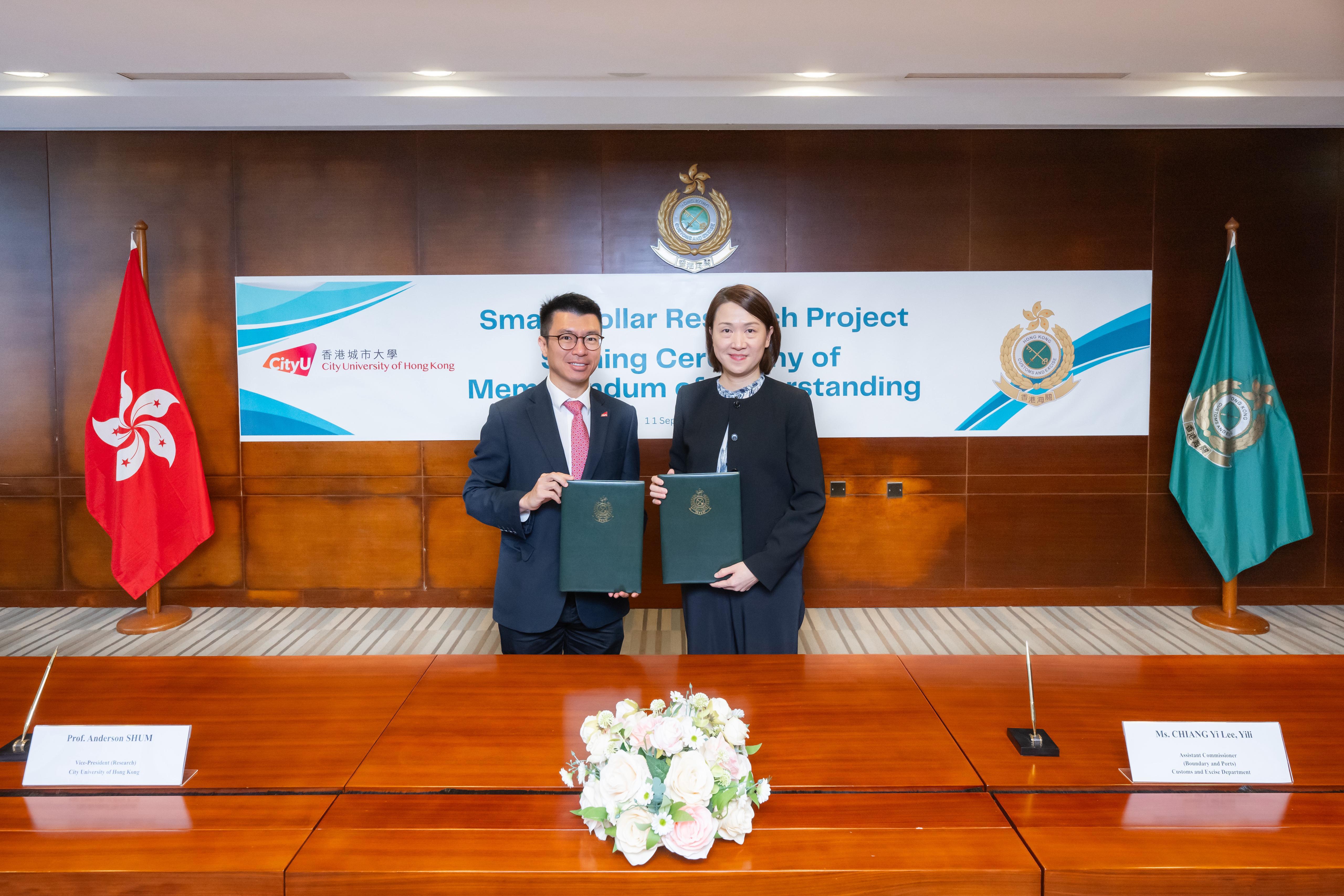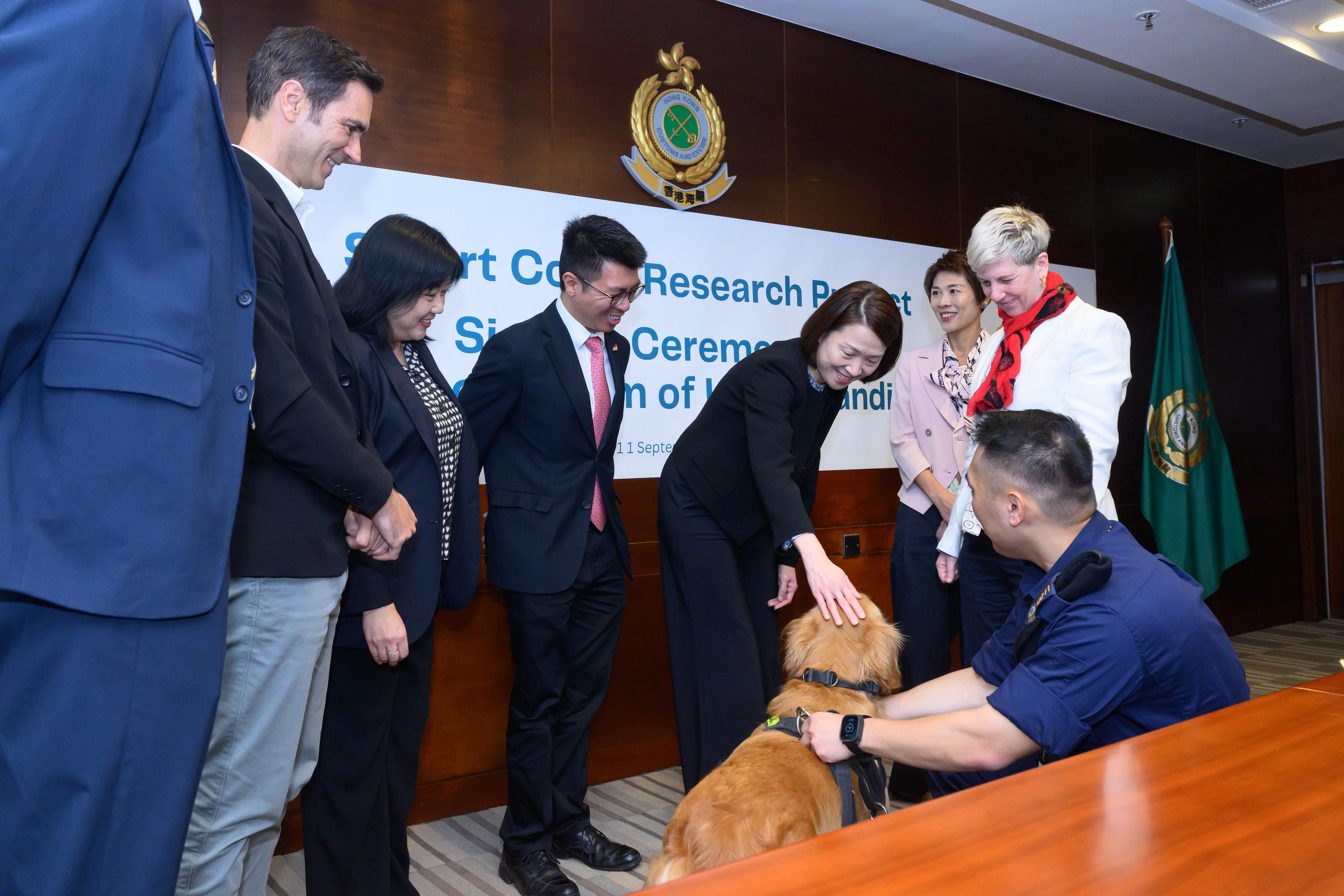 海关助理关长(边境及港口)蒋依莉今日(九月十一日)在海关总部大楼与香港城市大学(城大)签署合作备忘录,透过智能颈圈的数据研究和分析提升搜查犬的执法成效。