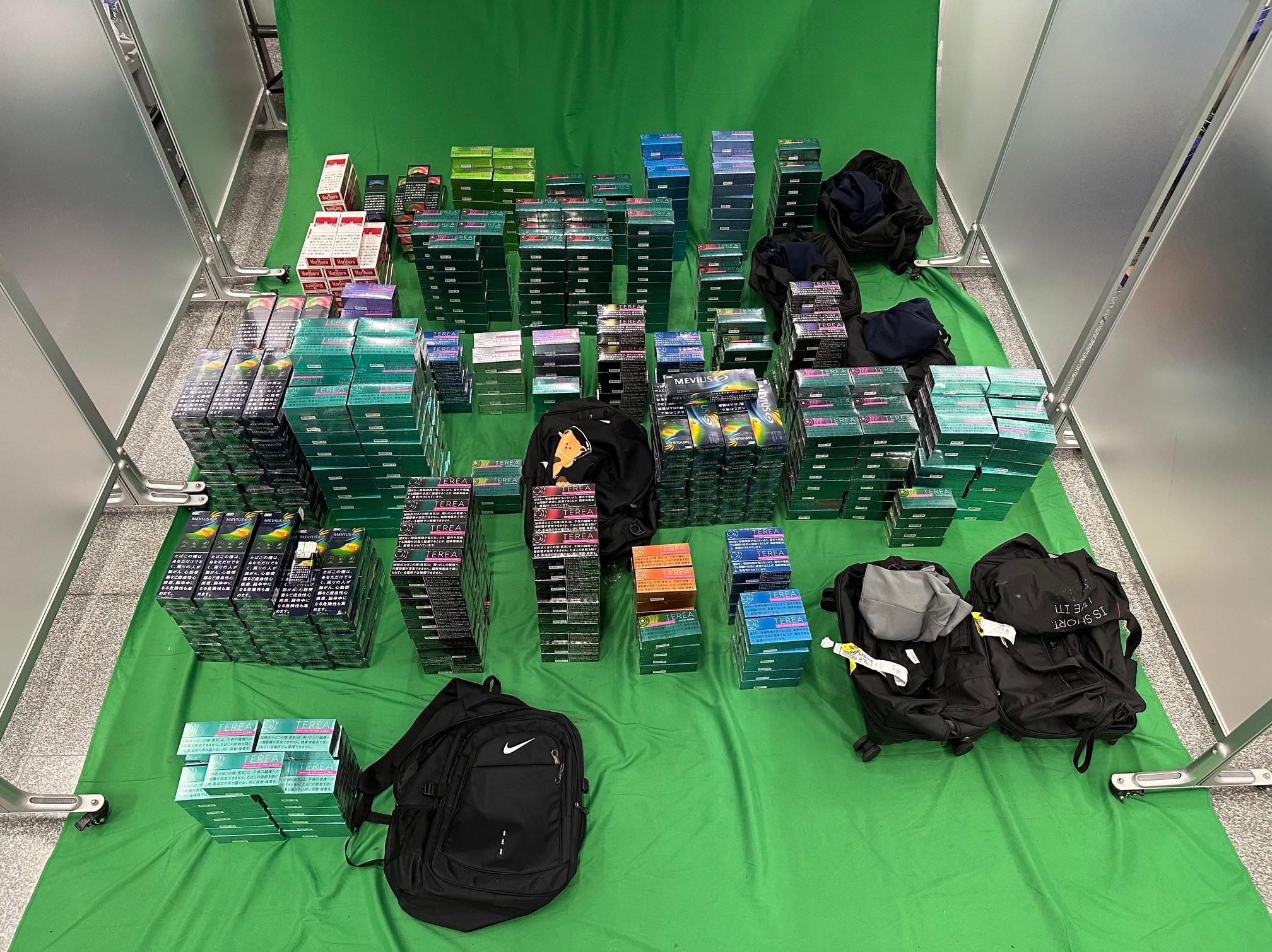 另外,海关人员八月二十五日在香港国际机场截查一名三十七岁的抵港男旅客,并在他的个人行李内共检获约三万三千支未完税香烟及约十四万件另类吸烟产品,市值共约五十七万三千元,应课税值共约十一万一千元。他随即被捕,并于今日在西九龙裁判法院就违反《应课税品条例》及《进出口条例》,被判处监禁十个月和罚款一千元。