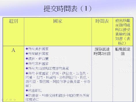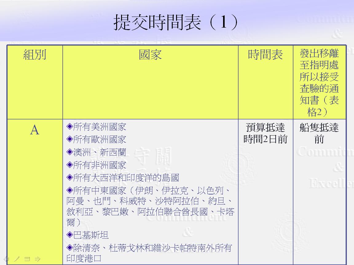 | 组别A | 10日或以上 | 预算抵达时间2日前 | 在预算抵达时间前发出“移离至指明处所以接受查验的通知书”(即表格2) |