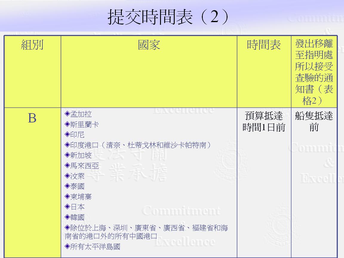| 组别B | 4至10日 | 预算抵达时间1日前 | 在预算抵达时间前发出“移离至指明处所以接受查验的通知书”(即表格2) |