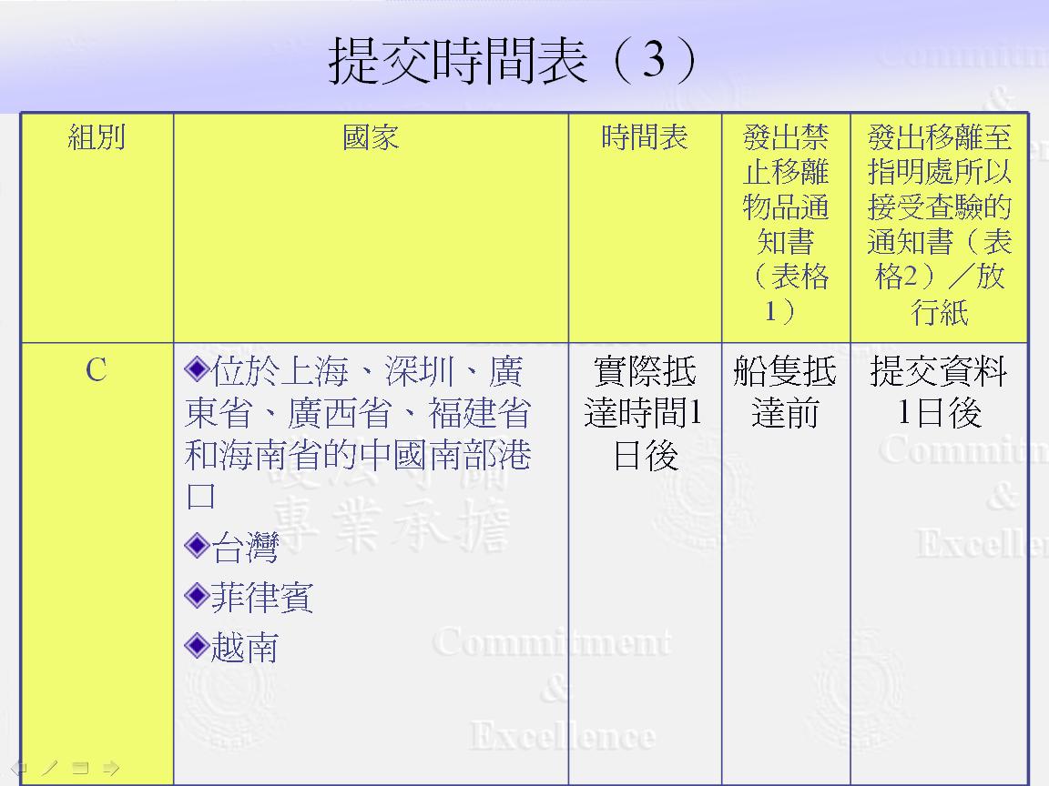 | 组别C | 3日或以下 | 实际到达时间1日后 | 发出“禁止移离物品通知书”(即表格1)”,并在提交1日后发出“移离至指明处所以接受查验的通知书”(即表格2)”或放行纸 |