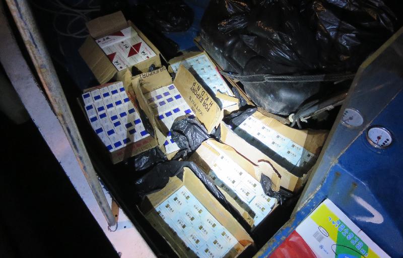 海關人員昨日下午在長洲以南水域截查一艘可疑機動舢舨,在船上發現約四萬支懷疑私煙、一百五十公升懷疑未完稅電油及二十六公斤爆竹,並拘捕船上一男兩女,年齡介乎五十五至六十九歲,機動舢舨亦被扣留。案件仍在調查中。