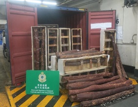 香港海關昨日(八月三日)在葵涌海關大樓驗貨場一個貨櫃內檢獲約二千八百三十公斤懷疑紫檀木材,估計市值約一百八十萬元。