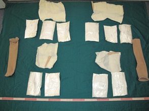 海關人員昨日(七月二十五日)在香港國際機場離境層截查兩名前往澳洲悉尼的男子,在他們的腿部位置搜出共重約2.8公斤海洛英,市值約二百一十萬元。
