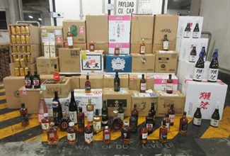 經檢查後,海關人員在貨櫃內發現該批懷疑未完稅烈酒及懷疑走私日本清酒和啤酒,並同時檢獲一批懷疑走私雜貨,包括寵物用品和日用品。