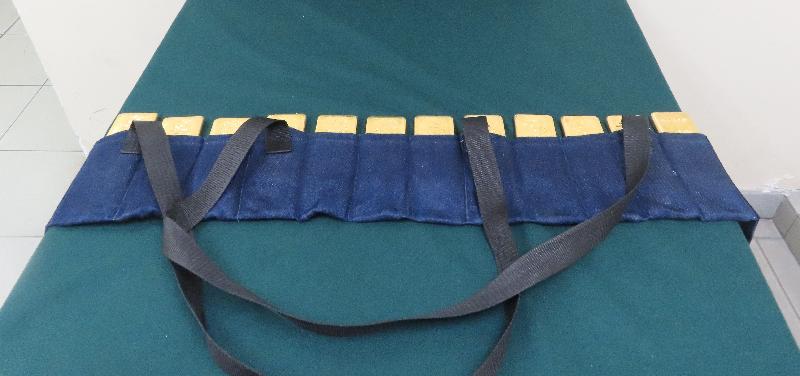 海關人員昨日在落馬洲管制站截查一輛入境貨車,在司機身上發現該批黃金,分別收藏在他穿着的特製腰封和牛仔褲的特製夾層內。五十一歲男司機被捕。