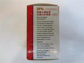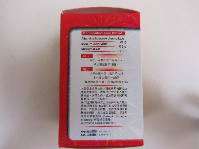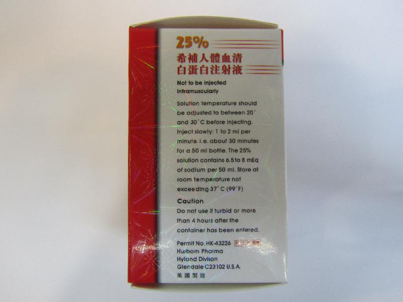 調查亦發現該款名為「25%希補人體血清白蛋白注射液」的包裝上印有虛假的衞生署註冊編號「HK-43226」。