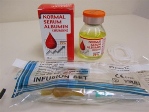 香港海關較早前在深水埗一間藥房檢獲十樽假人體血清白蛋白注射液,懷疑該批貨品並沒有如包裝上所列含有「Albumine humaine plasmatique」成分(「Albumine humaine plasmatique」亦即人體血清白蛋白)。該批檢獲的貨品價值五千元,案件中海關拘捕一名藥房男東主及一名男售貨員作進一步調查。